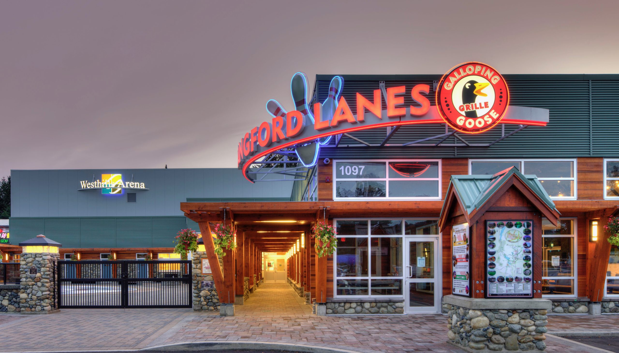 We made it work by bringing together a highly versatile mix of recreational, entertainment, and support spaces within one integrated facility. At the core of the project was the West Hills Arena, an NHL-sized venue designed with both indoor and outdoor components, including a unique seasonal “ice river” that connected the indoor rink to an outdoor skating pond through a garage door, made possible by extending the cooling lines outside for a seamless skating experience. The indoor arena was planned to support minor and adult hockey, public skating, and private rentals, while the dry floor system allowed the space to transition in the off-season for indoor soccer, ball hockey, lacrosse, inline hockey, trade shows, and concerts. This flexibility was complemented by a 24-lane bowling facility featuring 20 public lanes and 4 private lanes for events and parties, along with a full-service restaurant and bar attached to the bowling area. To ensure the arena operated at a professional standard, the project also included change rooms and all essential support amenities required for NHL-level operations.
